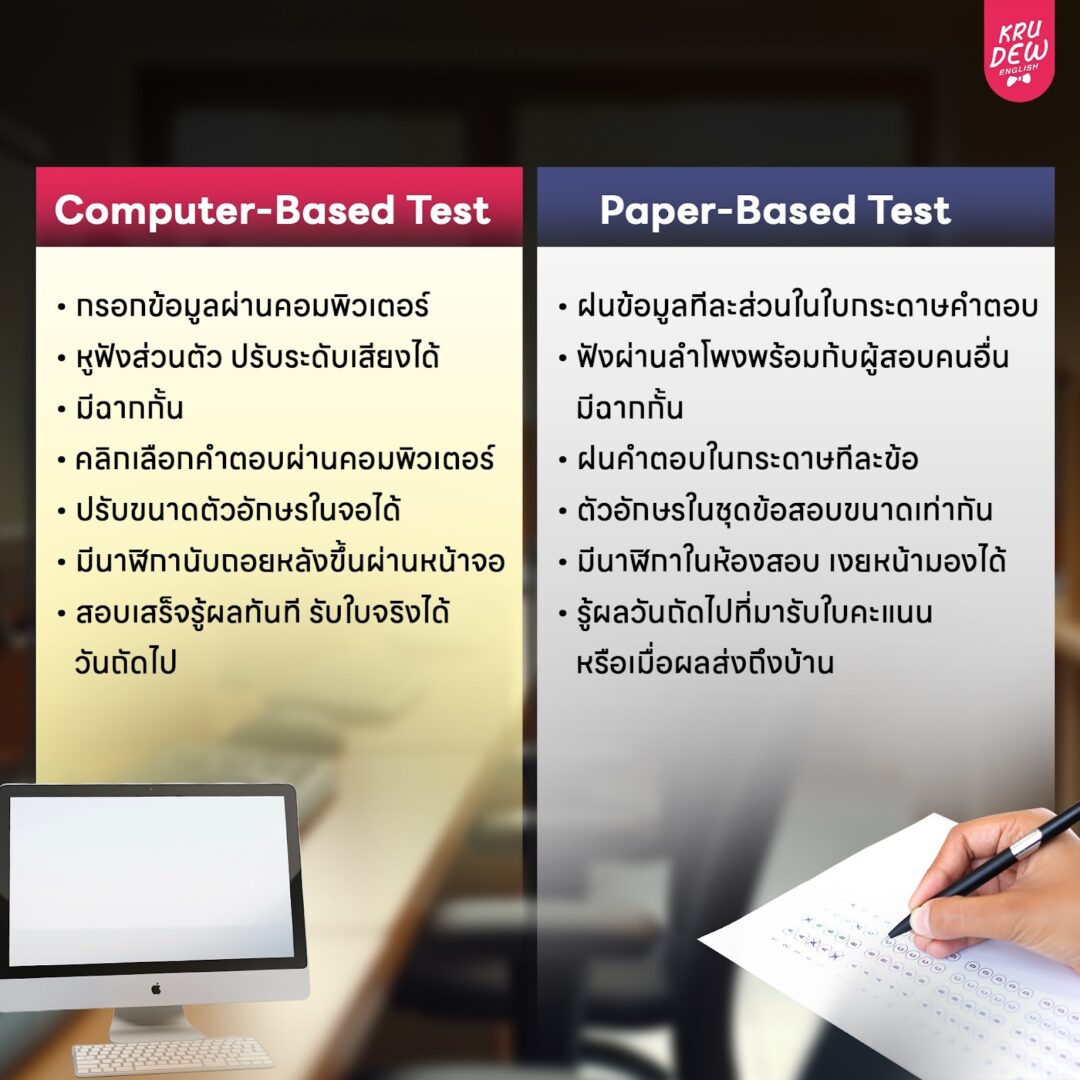 ในบทความนี้เราจะพาไปรู้จัก ข้อดี-ข้อเสียของแต่ละแบบ เปรียบเทียบแบบชัด ๆ ทั้งเรื่องการฟัง การอ่าน วิธีตอบ และความเร็วในการรู้คะแนน เพื่อช่วยให้ทุกคนเลือกสอบในแบบที่ “เหมาะกับตัวเองที่สุด” และไม่เสียคะแนนเพราะความไม่พร้อม