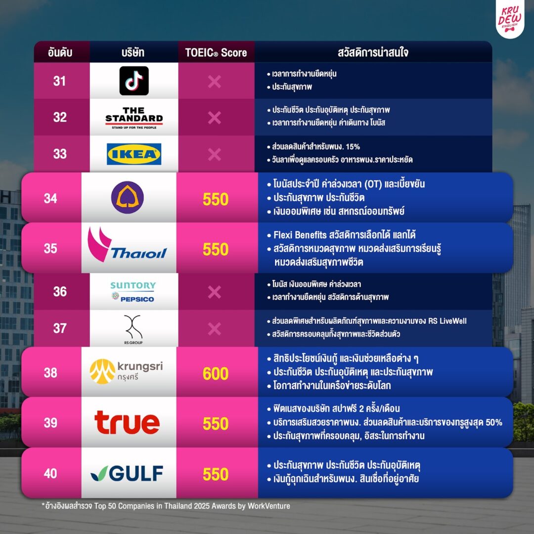 ในขณะที่บางบริษัทอาจไม่ได้ระบุคะแนน TOEIC® อย่างชัดเจน แต่พวกเขาก็มีสวัสดิการสุดพิเศษ เช่น อาหารฟรีในออฟฟิศ ห้องนวด และบริการรถรับส่ง เพื่อเพิ่มความสะดวกสบายและสร้างบรรยากาศการทำงานที่ดี