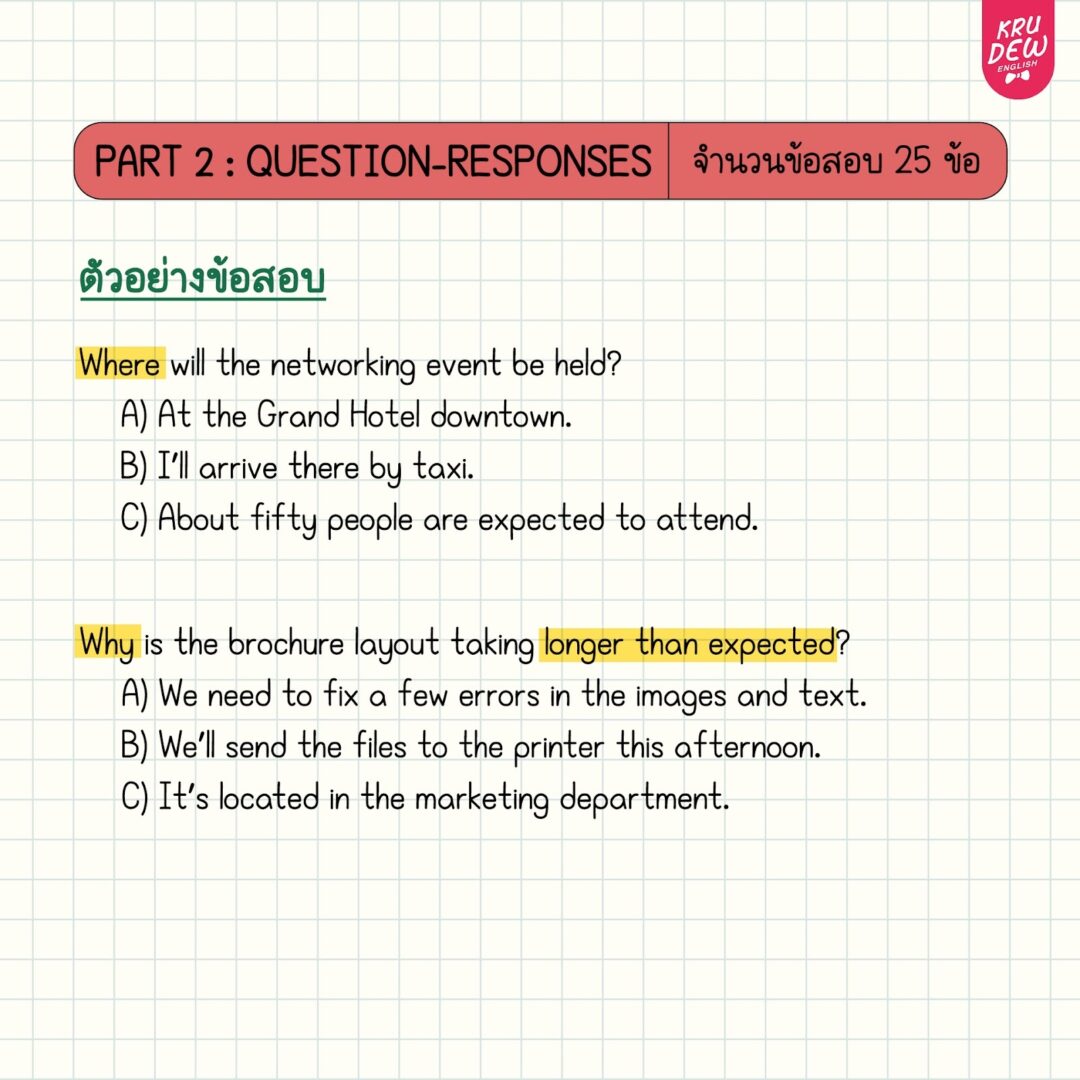 ⁕ บางข้อต้องตีความบทสนทนาด้วย เช่น คำถามว่า “When will you finish?” (เมื่อไหร่คุณจะทำเสร็จ) จะไม่มีที่ตอบตรงๆ แต่จะมีคำตอบประมาณว่า “It’s not my duty” (มันไม่ใช่หน้าที่ของฉัน)