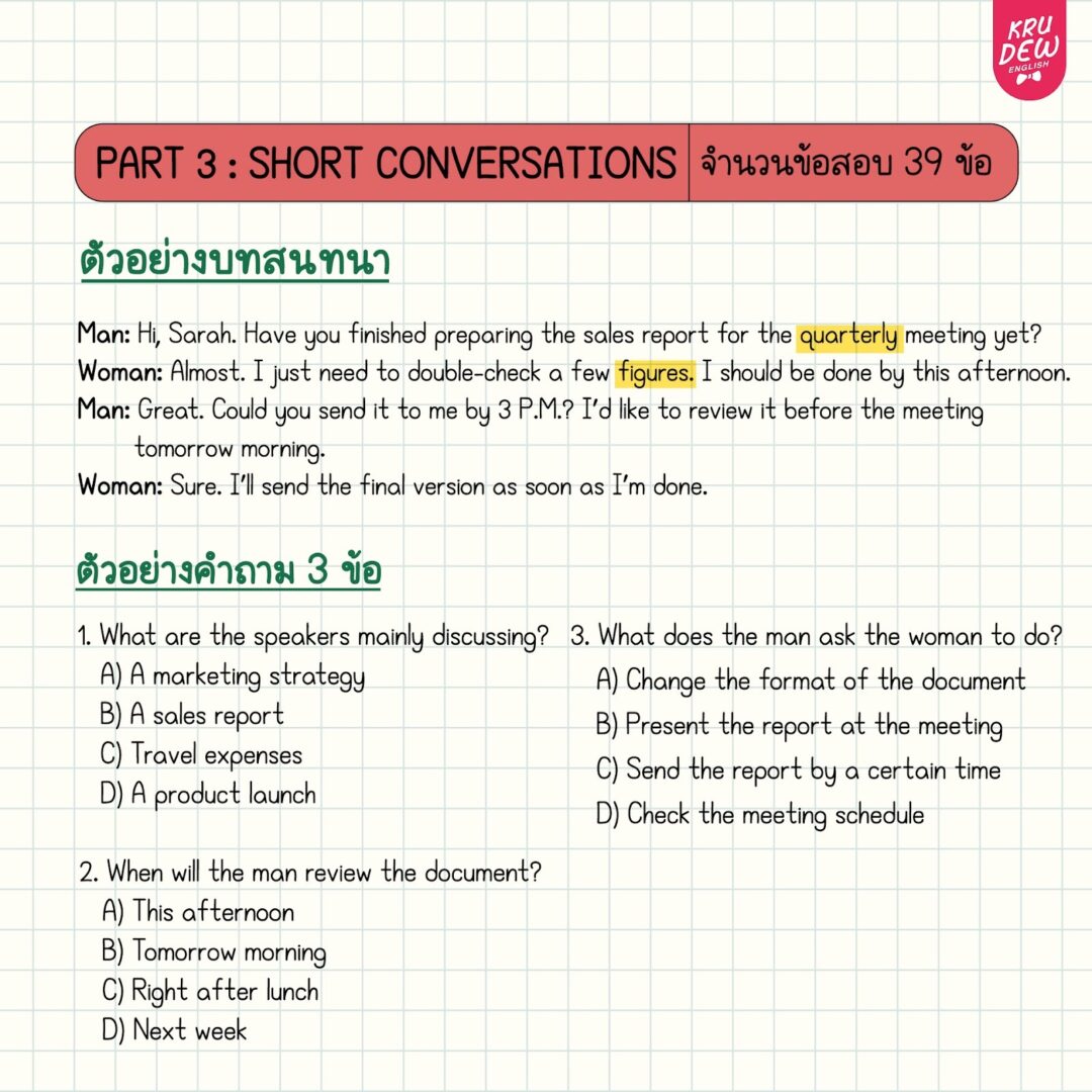 คำถามถามว่า ทั้งสองคนพูดคุยเรื่องอะไรเป็นหลัก? จากบทสนทนาจะเห็นว่าพวกเขาพูดถึงการจัดทำ “sales report” (รายงานยอดขาย) ที่จะใช้ในการประชุมรายไตรมาส