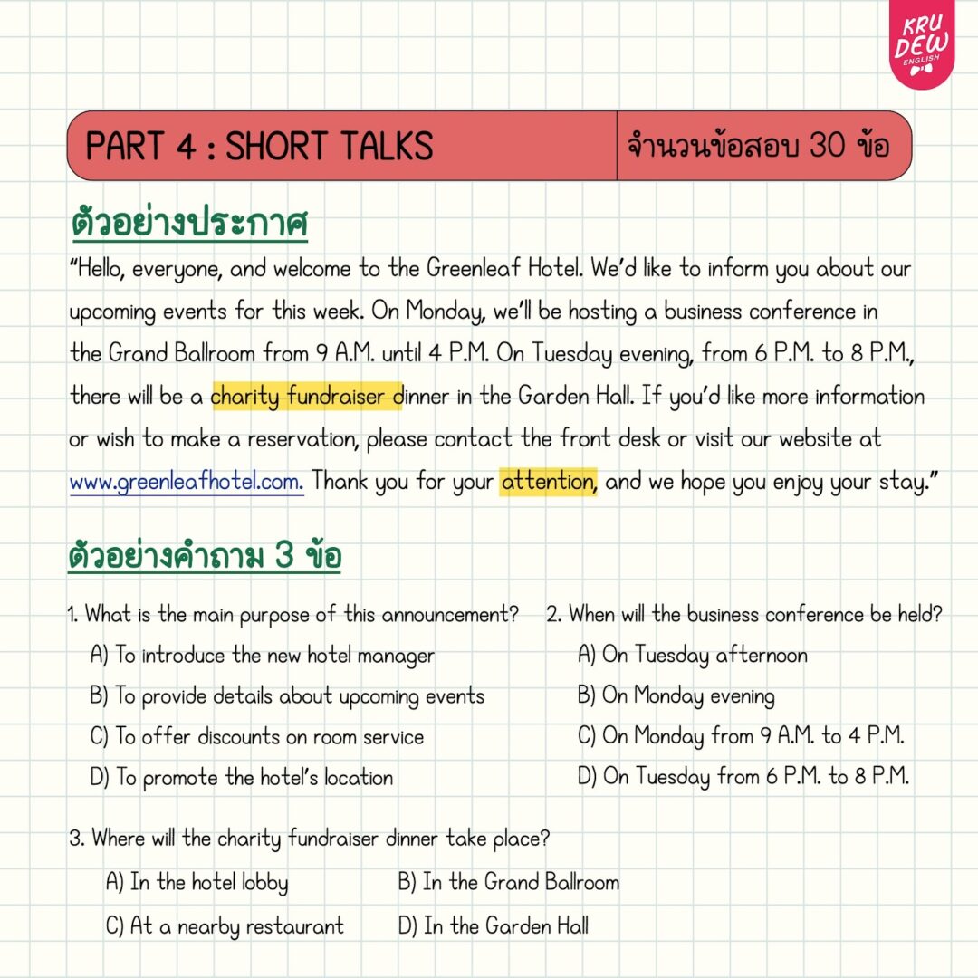 ⁕ Short Talks เป็นบทพูดที่ค่อนข้างยาว และคำตอบอาจจะอยู่ท้ายสุดด้วย ต้องตั้งใจฟังให้จบ