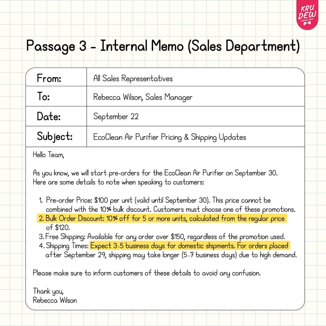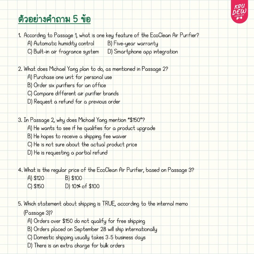 ⁕ เนื้อหามักเกี่ยวกับธุรกิจ การทำงาน การค้าขาย หรือการสั่งสินค้าที่ต้องดูข้อมูลให้ดีและต้องตีความให้ออก เพราะคำตอบอาจไม่ได้บอกไว้ตรงๆ